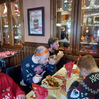 As soon as everyone gathered around the long tables, the room was filled with laughter, chatter, and the unmistakable sound of Christmas cheer. Plates were brimming with hearty roast dinners, golden Yorkshire puddings, and all the trimmings you’d expect from a traditional festive feast. For dessert, indulgent slices of cake and sweet treats added the perfect finishing touch.